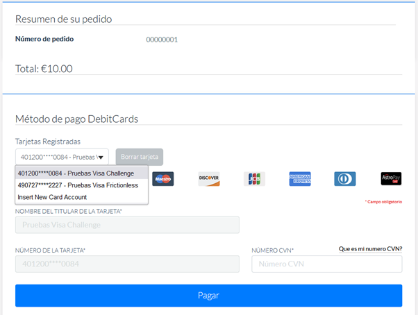• Tienes a tu disposición un listado de tarjetas para pruebas que permiten realizar transacciones simulando diferentes operativas, tipos de autenticación (frictionless, challenge) y resultados (autorizada, denegada).