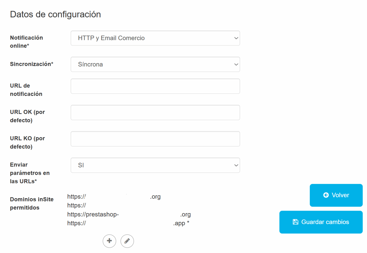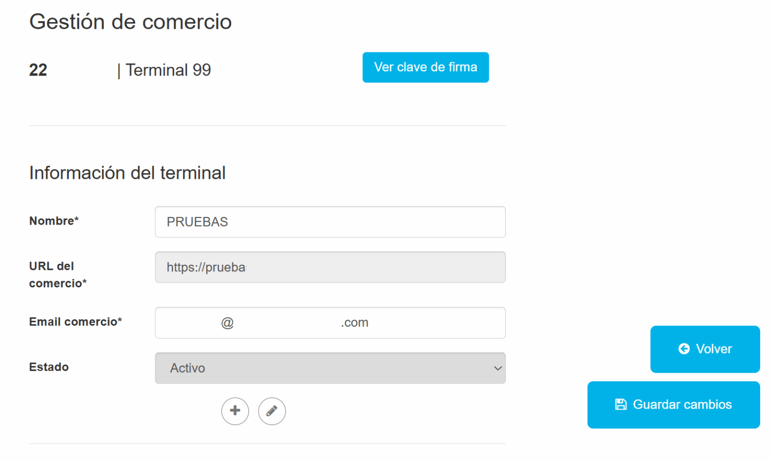 Configuración de comercio IntroducciónEn Canales puedes configurar algunas opciones de tu comercio. A continuación, te explicamos cuáles. No todas las opciones se pueden modificar. Para modificar alguna de las opciones que NO estén en este documento, consulta con soporte desde tu correo autorizado. Opciones de configuración de comercioSigue estos pasos para acceder a la Configuración de Comercio en Canales:1. Entra en el Canales del entorno en el que quieras configurar el comercio: EntornoURL Entorno de Pruebas o Sandboxhttps://sis-t.redsys.es:25443/admincanales-web/index.jsp#/loginCaixa Entorno de Producción o Realhttps://canales.redsys.es/admincanales-web/index.jsp#/loginCaixa 2. Ve a: Menú de navegación izquierdo > «Administración» (icono de maletín).3. Pulsa «Configuración de comercio». Si tienes más de un comercio, podrás filtrar cuál quieres configurar.Si tienes 1 comercio, verás la sección de configuración.A continuación se detallan las distintas opciones de configuración: Información del terminalLas primeras opciones de configuración son sobre la información del terminal, pulsa el icono del lápiz para modificarlas: Ver clave de firma: Pulsa para ver la clave SHA-256/512 de tu terminal. Esta clave cambia según el terminal y el entorno. Más detalles en Entorno de pruebas y producción.Nombre: Nombre del terminal.Email comercio: Dirección de correo electrónico que utiliza el terminal para recibir la notificación. Recuerda: No todas las opciones se pueden modificar. Para modificar algunas opciones debes dirigirte mediante tu correo autorizado a Soporte o a tu oficina. Datos de configuraciónLas siguientes opciones de configuración son las que se listan, pulsa el icono del lápiz para modificarlas: Notificación online: Establece el tipo de notificación que se envía cuando se realiza una transacción. Sincronización: Establece si la notificación que se envía al comercio es síncrona (se informa al comercio y luego al cliente) o asíncrona (se informa al comercio y cliente a la vez).La notificación síncrona puede ser SOAP, SOAP con WSDL, o SOAP document/literal. URL de notificación: URL a la que se envía la notificación. URL OK (por defecto): URL a la que se redirige al cliente si el pago es correcto. La URL que se envía en las peticiones de pago tiene PRIORIDAD sobre la indicada aquí. URL KO (por defecto): URL a la que se redirige al cliente si el pago es denegado. La URL que se envía en las peticiones de pago tiene PRIORIDAD sobre la indicada aquí.Enviar parámetros en las URLs: Establece si los parámetros de la notificación se envían en la URL OK o KO. Más información en la gestión de la notificación. Dominios inSite permitidos: Si utilizas la integración InSite, ya sea en módulos o integraciones a medida, debes indicar los dominios y subdominios de tu comercio para que cargue correctamente el formulario.