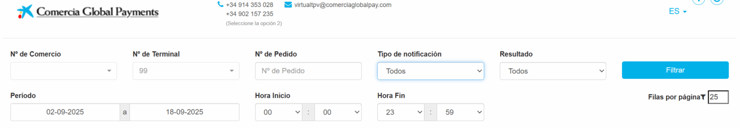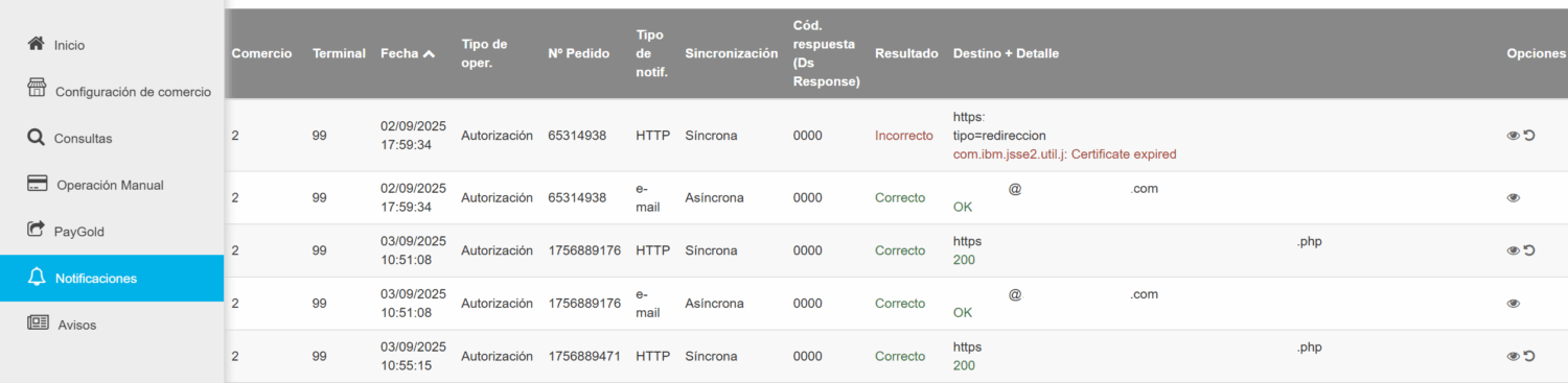 Consulta de notificaciones IntroducciónEn el Portal de Administración – Canales puedes consultar las notificaciones recibidas en tu TPV Virtual. Ten en cuenta que si la operación no ha finalizado, no se generará notificación. Estos son los datos sobre notificaciones que puedes consultar: A qué URL o correo electrónico se ha enviado la notificación. Si la notificación no se ha podido entregar, se indicará el motivo. La notificación en sí con todos los detalles de la operación. Detalles de la operación: Comercio y terminal, nº pedido, estado operación, etc. Las operaciones que no han finalizado no generan notificación. En las no finalizadas, puedes ver las operaciones en una Consulta de operaciones. Cómo hacer una consulta de notificacionesSigue estos pasos para hacer una consulta de notificaciones:1. Entra en el Canales del entorno en el que quieras consultar operaciones: EntornoURL Entorno de Pruebas o Sandboxhttps://sis-t.redsys.es:25443/admincanales-web/index.jsp#/loginCaixa Entorno de Producción o Realhttps://canales.redsys.es/admincanales-web/index.jsp#/loginCaixa 2. Dentro de Canales, ve a: Menú de navegación izquierdo > «Administración» (icono de maletín).3. Selecciona «Notificaciones». Verás un formulario en el que filtrar la consulta: Nº de comercio del que quieres hacer la consulta Nº de terminal del que quieres hacer la consulta Fechas entre las que se hará la consulta de operaciones. Puedes consultar operaciones de máximo 1 año de antigüedad, pero el periodo entre fechas no puede ser superior a 31 mes. Hora de inicio de la fecha inicial indica. Hora final de la fecha máxima indicada. Botón para iniciar la búsqueda una vez hayas establecido los filtros. Tipo de notificación:– HTTP– e-mail– SOAP Resultado de la entrega de la notificación Nº de pedido de la operación que quieras consultar. 4. Aplica los filtros a tu consulta y haz clic en «Buscar». 5. Se mostrará un listado con las notificaciones consultadas. Las columnas indican distinta información de la operación. En la columna «Destino + detalle» puedes ver el destino de la notificación (URL o mail). También puedes ver si la notificación se ha entregado en la columna «Resultado». Más opciones:– Pulsa el «Ojo» para ver más detalles de la notificación. Incluida la misma notificación.– En notificaciones enviadas a URL, pulsa la flecha para reintentar el envío. Fecha y hora en la que se realizó la operación. Nº de terminal en el que se ha realizado la operación. Tipo de operación realizada (autorización, devolución, etc.). Código de pedido marcado por tu plataforma de comercio o integración. Resultado de la entrega de la notificación. Nº de comercio. Tipo de sincronización de la notificación:– Síncrona– Asíncrona Código de respuesta de la operación. Tipo de notificación. Puede ser por mail o por URL. Destino y detalle de la notificación. Indica la URL o el mail al que se envía la notificación, y en el caso de que haya algún error, indica el motivo. 6. Puedes ver los detalles de la notificación pulsando en «Detalles» (icono del ojo). También podrás reintentar el envío de la notificación a la URL indicada. Aquí podrás ver la notificación. Ya sea transparente (email) o codificada (URL).7. Si la consulta es de muchas operaciones, podrás pasar de hoja al final de la página. También podrás aumentar el nº de filas por página.