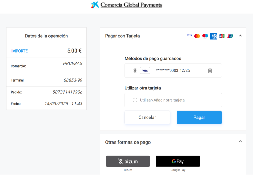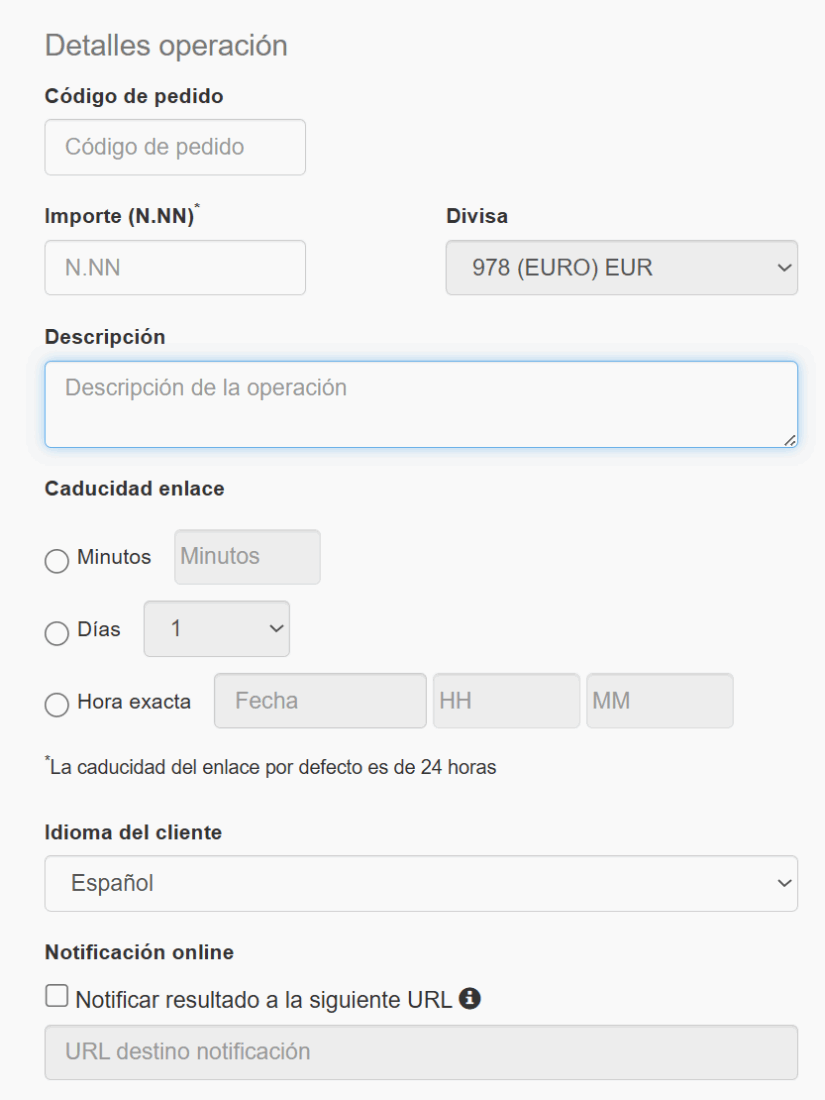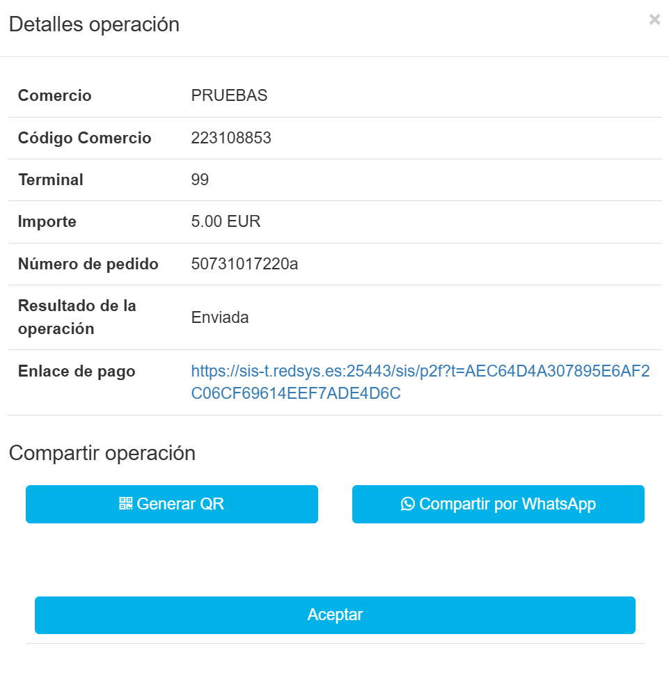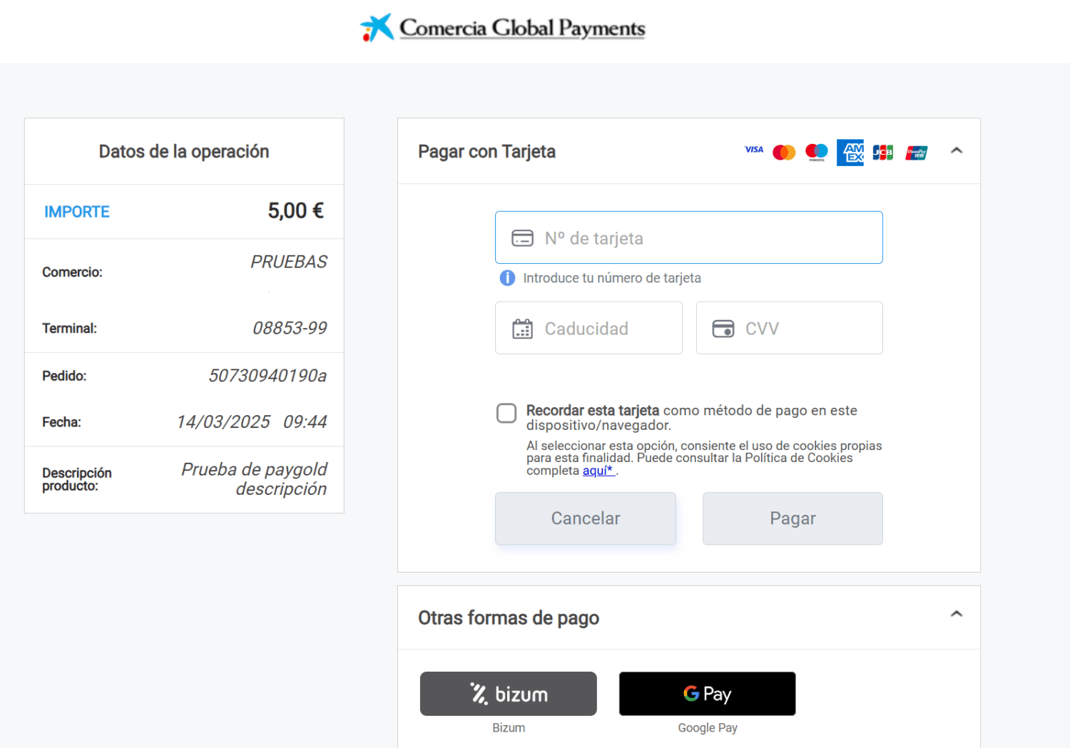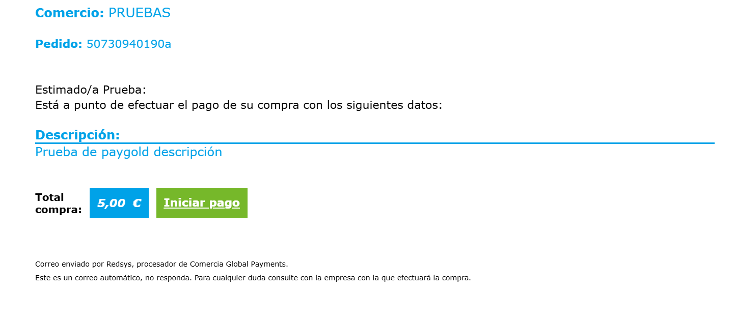 PayGold desde Canales ¿Qué es PayGold?PayGold permite solicitar pagos a clientes de forma rápida y segura mediante un enlace que se envía directamente al cliente. No es necesario disponer de una tienda online, aunque también puede utilizarse sin problema en comercios que ya cuentan con una.El enlace de pago puede enviarse por:SMSCorreo electrónicoWhatsAppCódigo QR.Al acceder al enlace, el cliente es dirigido a la pasarela de pago del TPV Virtual, donde puede completar la transacción de forma sencilla y totalmente segura. Además, si la pasarela cuenta con una personalización, esta se aplica igualmente a las operaciones realizadas con PayGold.Esta solución es ideal para cobrar servicios personalizados, ajustes de precio o importes adicionales fuera del entorno habitual de venta online.Activación y uso de PayGoldPuedes generar un enlace de pago PayGold mediante Canales (como verás en este documento) o mediante petición REST.Tienes que solicitar a Oficina su activación. Una vez activado Paygold, aparecerá en el menú lateral de Canales como «PayGold». Tienes que solicitar la activación de PayGold a Oficina. Cómo usar PayGold desde CanalesSigue estos pasos para enviar un enlace de pago mediante PayGold desde canales:1. Entra en el Canales del entorno donde quieras usar Paygold: EntornoURL Entorno de Pruebas o Sandboxhttps://sis-t.redsys.es:25443/admincanales-web/index.jsp#/loginCaixa Entorno de Producción o Realhttps://canales.redsys.es/admincanales-web/index.jsp#/loginCaixa 2. Dentro de Canales, ve a: Menú de navegación izquierdo > «Administración» (icono de maletín).3. Clica «PayGold». 4. Si tu usuario tiene más de un comercio o terminal, tienes que seleccionar el nº de comercio y el terminal para el que quieras generar el enlace de pago. 5. Rellena los detalles de la operación. En la imagen inferior tienes los detalles de cada campo: Código de pedido: Opcional. Nº de pedido para identificar el pago. Si no se rellena se genera uno aleatorio. – Debe ser único para cada pedido. No se permiten pedidos repetidos. – Sólo acepta letras y números. Importe (N.NN): Requerido. Importe de la operación, incluidos decimales. Divisa: No es modificable. Divisa en la que está configurado el terminal. Si tienes varios terminales con varias divisas, índica el terminal más arriba de la divisa que desees. Descripción: Opcional. Describe el producto o servicio que va a pagar el cliente. Se muestra en el correo electrónico enviado al cliente y en la pasarela de pago. Caducidad enlace: Opcional. Caducidad del enlace desde que lo enviamos. Si no indicas nada, la caducidad por defecto es de 24 horas. Idioma del cliente: Opcional. Selecciona el idioma de la pasarela de pago y del SMS y el correo electrónico por defecto que se envía. Notificación online: Opcional. Elige si enviar una notificación cuando el cliente finalice el pago. Ten en cuenta que tendrás que realizar un desarrollo para recibir la notificación en la URL. – Independientemente de esta opción, recibirás una notificación en tu cuenta de correo indicada y podrás ver el resultado de la operación en Canales. 6. Rellena los detalles del comprador. En la imagen inferior tienes los detalles de cada campo: Nombre cliente: Requerido. Nombre del cliente al que enviamos el enlace de pago. Aparece en el correo o SMS enviado. Correo: Requerido. Correo electrónico del cliente al que le llegará el enlace de pago. No hace falta enviarlo si ya se envía a un nº de teléfono. Asunto del correo: Opcional. Asunto del correo con el enlace de pago que se envía al cliente. Si no se rellena, se envía con un asunto por defecto. Teléfono: Requerido. Nº de teléfono del cliente al que se le envía el enlace de pago. Se envía mediante SMS. No hace falta indicarlo si ya se indica correo electrónico. Texto SMS: Opcional. Texto del SMS que se le envía al cliente con el enlace de pago. 7. Una vez rellenes todos los campos, pulsa «Enviar». Esto enviará el enlace de pago al SMS y/o Correo electrónico que hayas indicado. Formas de enviar el enlace Tras enviar el enlace de pago, se mostrará una ventana de detalles del mismo. Puedes enviar el enlace por otro medio distinto al correo o el SMS que hayas marcado: Copia el Enlace de pago clicando sobre el mismo.Pulsa en «Generar QR» para crear un código QR con el enlace de pago.Para compartir directamente por WhatsApp, clica en «Compartir por Whatsapp». ¿Qué pasa una vez envío el enlace al cliente?Una vez envías el enlace de pago al cliente:1. El cliente recibe el enlace por correo, SMS o por el otro medio que hayas utilizado. Estos son unos ejemplos de cómo se ve el enlace de pago por correo y por SMS: 2. Si el enlace ha caducado dará error. 3. El cliente sigue el enlace y paga de forma ordinaria por redirección. Esta es la pasarela de pago. Si la tarjeta se ha guardado previamente, podrá utilizar esa misma tarjeta (segunda captura): 4. La operación se realiza correctamente. El comercio recibe una notificación al correo que haya marcado y la operación aparece reflejada en Canales. Devoluciones PayGoldLas devoluciones de una operación realizada desde un enlace de pago (Paygold) se pueden realizar desde canales como cualquier otra operación.El Tipo de operación es «Autorización Paygold». Consulta cómo hacer la devolución: Devolución desde Canales