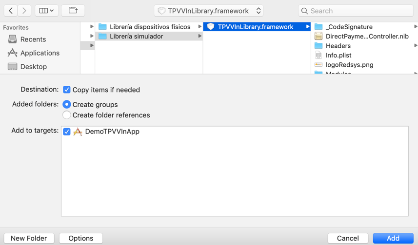 Integración iOS IntroducciónEn esta página se explica cómo realizar la integración vía inApp en un desarrollo para dispositivos iOS.Puedes integrar inApp para iOS usando pago directo o pago por WebView. En esta página se explican ambas.Para realizar esta integración te recomendamos usar la librería de SDK para inApp. Te ayudarán a integrar los servicios de Redsys dentro de tu aplicación sin tener que programar toda la integración desde cero. Librerías de Redsys ConfiguraciónPara realizar este tipo de integración, es necesario tener una configuración previa. Sigue estos pasos:Integra la librería en el proyecto. Para ello, marca la opción «Copy items if needed». Añade los binarios al proyecto: En el apartado de «Frameworks, Libraries and Embedded Content» del Taget, selecciona «Embed & Sign». Importa TPVVInLibrary al proyecto.En SWIFT: import TVVLibraryEn Objective: #import <TPVVInLibrary/TPVVInLibrary-Swift.h>Opción Enable Bitcode: Para una correcta compilación y ejecución de la App, es recomendable acceder a la opción de «Enable Bitcode» y ponerle a «NO». Esta opción podrá encontrarla en el Build Settings del correspondiente Target.Publicar en el App Store: Para poder realizar la subida de la aplicación en el App Store, debes tener la librería integrada en el framework para dispositivos móviles físicos. Además son necesarios dos requisitos:Utilizar una versión de XCode igual o superior a la 11.1 para el desarrollo.Utilizar como base el SDK de iOS 13. Pago directoPara realizar un pago directo, es necesario haber configurado previamente los parámetros obligatorios en el objeto TPVVConfiguration. Tras fijar estos parámetros, en cada pago es necesario indicar los siguientes campos:orderNumber: Código alfanumérico identificativo de la operación que tiene que ser único. Este parámetro es obligatorio.amount: Importe de la operación. Este parámetro es obligatorio.transactionType: Tipo de transacción a realizar, se debe especificar usando las definidas en TPVVConstants (véase la tabla más adelante). Este parámetro es obligatorio.uiViewConfig: Personalización de la vista de pago directo. Este parámetro es obligatorio.identifier: Referencia de pago. En caso de no indicar nada, realiza un pago normal. En caso de introducir una referencia válida, se realiza un pago por referencia (ver documentación en el apartado de Tokenización, Pagos 1-clic y Operativa COF). Si se quiere solicitar la creación de una referencia, se debe usar el valor de la constanteTPVVConfiguration.shared.REQUEST_REFERENCEproductDescription: Descripción del pago.extraParams: Diccionario de valores clave-valor: En caso de querer utilizar parámetros adicionales en la operación, se pueden introducir aquí.El parámetro TPVVConstants puede tener los siguientes valores en Swift y Objective: Swift Objective Normal: TPVVConstants.PAYMENT_TYPE_NORMALPreautorización: TPVVConstants.PAYMENT_TYPE_PREAUTHORIZATIONTradicional: TPVVConstants.PAYMENT_TYPE_TRADITIONALAutenticación: TPVVConstants.PAYMENT_TYPE_AUTHENTICATION Normal: TransactionTypeNormal;Preautorización: TransactionTypePreauthorization;Tradicional: TransactionTypeTraditional;Autenticación: TransactionTypePaymentTypeAuthentication; PersonalizaciónEs posible personalizar algunos aspectos de la pantalla de pago directo. Para ello, hay que llevar a cabo la configuración usando el objeto TPVInAppUIConfig:logo: logo mostrado.setBackgroundViewColor: color de fondo de la pantalla.setBackgroundImageView: imagen de fondo de la pantalla.setCancelButtonText: texto del botón de cancelar.setContinueButtonText: texto del botón de continuar.setNumberCardLabel: texto, color y fuente del campo de número de tarjeta.setExpireDateLabel: texto, color y fuente del campo de fecha de caducida.setCVVLabel: texto, color y fuente del campo del código de CVV.setInfoPaymentLabel: texto, color y fuente del texto descriptivo.A continuación puedes ver un ejemplo de código de personalización del pago directo en iOS en Swift y Objective: Swift Objective //Se instancia la personalización let labelCardNumber: PaymentUILabelConfig = PaymentUILabel.create(text: "N.º de tarjeta", textColor: .black, textFont: .systemFont(ofSize: 16, weight: .semibold)) let labelExpiredDate: PaymentUILabelConfig = PaymentUILabel.create(text: "Caducidad", textColor: .black, textFont: .systemFont(ofSize: 16, weight: .semibold)) let labelCVC: PaymentUILabelConfig = PaymentUILabel.create(text: "Cód. seguridad", textColor: .black, textFont: .systemFont(ofSize: 16, weight: .semibold)) let infoPayment: PaymentUILabelConfig = PaymentUILabel.create(text: "Por favor, compruebe que el número de tarjeta y el resto de datos son exactamente los mismos que aparecen en la tarjeta.", textColor: .black, textFont: .systemFont(ofSize: 16, weight: .semibold)) let extraParams: [String:String] = [“Extra1”:”valor1”,”Extra2”:”valor2”] let uiConfig = TPVInAppUIConfig() .setCancelButtonText("Cancelar") .setContinueButtonText("Continuar") .setNumberCardLabel(labelCardNumber) .setExpireDateLabel(labelExpiredDate) .setCVVLabel(labelCVC) .setInfoPaymentLabel(infoPayment) .setLogo(logo: UIImage(named:"logoEntidad")) .setBackgroundImageView(image: UIImage(named:"background")) .setBackgorundViewColor(color: .lightGray) //Se crea el objeto de pago let dpView = DirectPaymentViewController(orderNumber: order, amount: amount.floatValue, productDescription: productDescription, transactionType: operationTypeValue, identifier: paymentIdentifier, extraParams: extraParams, uiViewConfig: uiConfig) dpView.delegate = self present(dpView, animated: true, completion: nil) //Se instancia la personalización PaymentUILabelConfig *labelCardNumber = [[PaymentUILabelConfig alloc] initWithText:@"Número Card" textColor:UIColor.blackColor textFont:[UIFont fontWithName:@"HelveticaNeue" size:16]]; PaymentUILabelConfig *labelExpiredDate = [[PaymentUILabelConfig alloc] initWithText:@"Expiry date" textColo