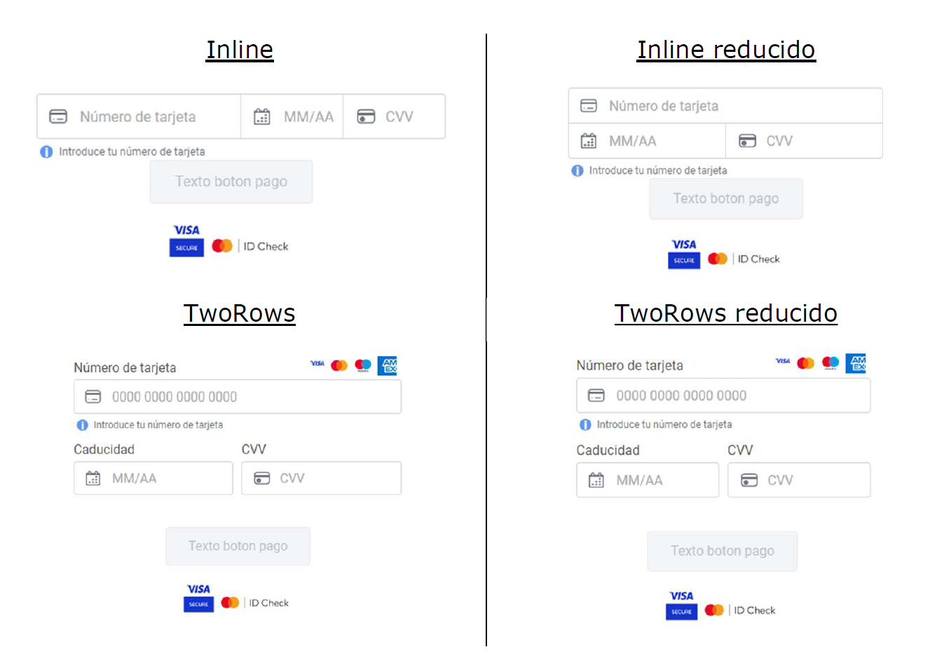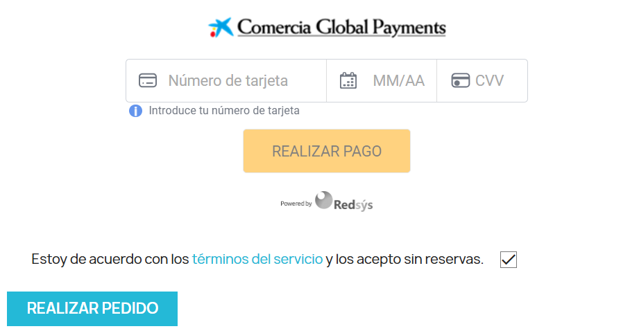 InSite ¿Qué es la integración InSite?La integración InSite consiste en incrustar el formulario de pago en tu página web. De esta forma, los clientes están introduciendo su información de pago en el TPV Virtual sin salir de tu página web. Como los datos de pago los gestiona el TPV Virtualy no pasan por tus sistemas, no tienes que cumplir con la normativa PCI DSS. La operación de pago debe completarse mediante una conexión REST. Cuando el cliente completa la información en el formulario de pago, se devuelve un ID de operación (idOper) que se debe enviar mediante conexión REST para completar el pago. En este documento veremos cómo invocar el formulario de pago en tu página web y cómo obtener el ID de operación. La operación de pago en la integración InSite tiene que completarse mediante una conexión REST. Estas son las ventajas de la integración InSite: Experiencia de pago totalmente integrada en tu página web. No tienes que preocuparte del cumplimiento de la normativa PCI-DSS. Numerosas operativas disponibles. Este es un ejemplo del cajero de pago que se incrusta en tu página web: Además, los campos del cajero pueden incluirse de distintas formas: Integración InSite: paso a pasoA continuación tienes los pasos para realizar la integración InSite. Recuerda: Adapta los ejemplos de código a tus necesidades. Los bloques de código son un ejemplo para entender más fácilmente el proceso. Adapta tu código a tus necesidades. Consulta las librerías de Redsys para ver más ejemplos Librerías de Redsys Paso 1: Añadir dominios InSite en CanalesLos dominios y subdominios de tu sitio web, desde donde se cargará el formualario InSite, se tienen que indicar en Canales. Esta gestión la realiza Soporte. Indica a Soporte los dominios de tu sitio web que quieres incluir. Puedes ir haciendo los siguientes pasos mientras se gestiona este. Paso 2: Incluir el fichero JavaScriptEl segundo paso de la integración InSite es incluir el fichero JavaScript alojado en el servidor de Redsys.Hay un fichero para entorno de Pruebas y otro para Producción, se incluye con una línea de código que cambia según el entorno. Incluye esta línea de código en el body de tu integración: Fichero Pruebas Fichero producción El siguiente paso es incrustar los campos del formulario de pago en tu página web. Puedes incluir los elementos de forma unificada todo en uno (3a) o de manera independiente (3b). Paso 3a, opción formulario unificado todo en unoEn esta modalidad de la integración InSite, el TPV Virtual proporciona un único iframe que incluye todo el formulario de pago: número de tarjeta, fecha de caducidad, CVV y botón de envío. Esta solución es ideal si deseas simplificar la integración y mantener una experiencia de usuario fluida sin salir de tu web.Las características principales:Formulario completo en un único iframe.Detección automática de la marca de tarjeta.Validación de formato en tiempo real (por ejemplo, longitud del número, formato de caducidad, etc.).Personalización del diseño mediante estilos CSS definidos por el comercio.¿Cómo integrarlo?Incluye los siguientes elementos en el body de tu integración: 1. Incluir la función de validación y el listener: Es necesario definir una función para validar los datos del formulario (si procede) y un listener que recoja la respuesta con el ID de operación (token) o el código de error: 2. Añadir los elementos en tu HTML: Debes crear un contenedor con un ID único donde se insertará el iframe, así como dos campos ocultos para recoger la respuesta: En las librerías de Redsys se proporciona la función storeIdOper() dentro de su API, que almacena la respuesta en los campos ocultos definidos.3. Llamar a la función para generar el formulario: Finalmente, debes llamar a la función getInSiteForm() para generar el formulario indicando el ID del mismo dentro del contenedor definido (card-form). getInSiteForm( 'card-form', // ID del contenedor estiloBoton, // Estilo CSS para el botón estiloBody, // Estilo CSS general del formulario estiloCaja, // Estilo del fondo de la caja de datos estiloInputs, // Estilo de los inputs (color, tipografía…) 'Texto botón pago', // Texto a mostrar en el botón fuc, // Número de comercio terminal, // Número de terminal merchantOrder, // Número de pedido 'ES', // Idioma del formulario true // Mostrar logo de la entidad (true/false) ); Tienes que informar de los campos relacionados con el comercio, estos son: CampoDescripciónRequerido/Opcional fucNúmero de comercio proporcionado. No cambia entre entornos.Requerido terminalNúmero de terminal.Requerido merchantOrderNúmero de pedido que identifica la operación en el TPV Virtual. El número de pedido que se utilice en este paso debe ser el mismo que el utilizado en la posterior petición de pago. Requerido idiomaIdioma del formulario (por ejemplo: ES, EN, FR…).Opcional mostrarLogoEntidadIndica si se debe mostrar el logo de la entidad (true / false).Opcional El número de pedido (merchantOrder) debe ser el mismo durante el renderizado del iframe y generación del idOper (en este paso que acabamos de ver) y durante la petición de pago por REST posterior. Puedes modificar estilos CSS con estos campos. El valor de estos campos es en formato CSS y su envío es opcional: ParámetroDescripción estiloBotonPersonaliza el aspecto del botón de pago (colores, borde, fuente, etc.). estiloBodyDefine el color de fondo, estilo de textos y diseño general del formulario. estiloCajaFondo y color del bloque de introducción de datos. Afecta también al placeholder. estiloInputsPersonaliza la fuente, color y estilo de los campos de entrada (tarjeta, fecha…). Importante: En el campo «Texto botón de pago», debe codificarse en caracteres HTML para evitar problemas de codificación. Por ejemplo, «Botón» sería: «Botón».4. Indica al navegador que ejecute la función «loadRedsysForm»: Esta función se ejecuta cuando finaliza la carga de la pá