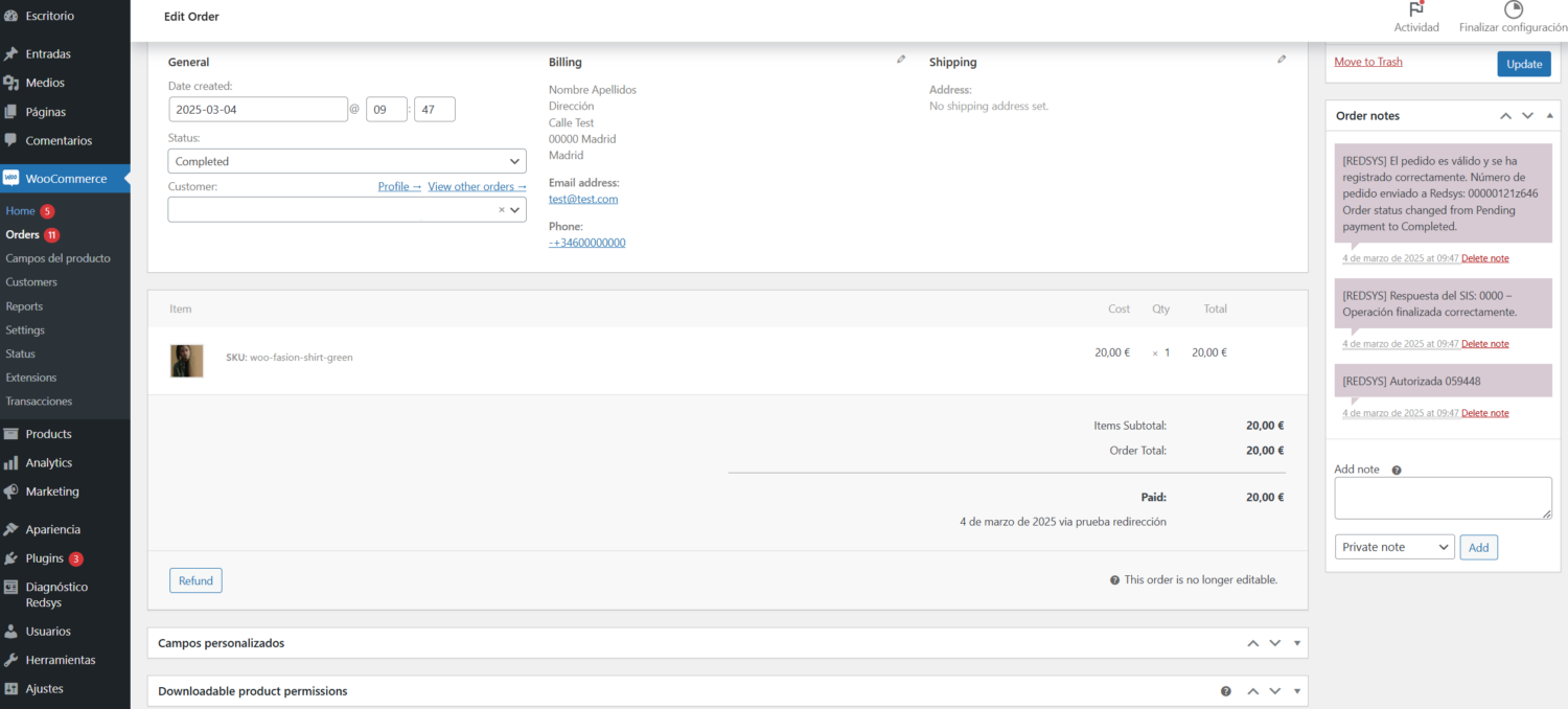 WooCommerce Módulo de pago WooCommerce (WordPress)Si tu tienda funciona con WooCommerce (WordPress), puedes instalar el módulo o plugin de pago.Previo a la instalación, necesitas cumplir estos requisitos: Disponer del Cyberpac dado de alta y haber recibido el Welcome Pack. WordPress y WooCommerce instalados y funcionales. Instalación y configuración del módulo Vídeo de apoyo – Instalación y configuraciónEn este vídeo puedes ver de forma visual la forma de instalar y configurar el módulo de pago de WooCommerce (WordPress). Paso a paso – Instalación y configuración del móduloLos pasos a seguir en el proceso de instalación y configuración del módulo de pago en WooCommerce son:Obtener credenciales del Welcome Pack y descargar del módulo.Instalar el módulo.Configurar el módulo y las operativas.Pruebas, pase a producción y errores frecuentes.Consulta el detalle de cada paso en las siguientes secciones. Paso 1: Obtén credenciales del Welcome Pack y descarga el móduloCon el alta del Cyberpac recibes un Welcome Pack a modo de correo electrónico con los datos y credenciales necesarios para empezar configurar el módulo. Estos son:Número de comercioNúmero de terminalClave secreta de cifradoSi ya tienes localizados estos datos, puedes pasar a descargar el módulo de pago de WooCommerce en el siguiente enlace: Descarga el módulo de WooCommerce Notas de versión: Consulta esta página de las notas de versión para ver los cambios del módulo.Ve a la sección de WooCommerce y clica en «Descargar módulo».Descargarás una carpeta comprimida. Descomprímela.Dentro de la carpeta descomprimida encontrarás:Una carpeta comprimida llamada «redsyspur». No descomprimas esta carpeta. La documentación y aviso legal en PDF. Paso 2: Instala el módulo Para instalar el plugin de la pasarela de pago, debe haberse instalado la extensión de WooCommerce, de lo contrario la web podría quedar inaccesible. Aunque el módulo tiene métodos para detectar que no se están cumpliendo los requisitos. Con el módulo descargado, instala el módulo de pago siguiendo estos pasos:En el BackOffice de WordPress, ve a «Plugins» > «Plugins instalados».Si ya has instalado el módulo sin WooCommerce o quieres borrarlo para actualizarlo: Borra la carpeta «redsyspur» de la carpeta del módulo en WordPress. Se suele encontrar en: {instalación_wordpress}/wp-content/pluginsPara instalar el módulo, clica en «Añadir nuevo plugin».En la página que se abre, pulsa en «Subir plugin».Selecciona la carpeta comprimida «redsyspur» que has descargado y pulsa «Instalar ahora».Cuando se instale correctamente, pulsa el botón «Activar plugin».Una vez activado lo encontrarás en la página «Plugins instalados».Para su configuración, busca el plugin «Pasarela Unificada de Redsys para WooCommerce» y pulsa en «Ajustes».Busca el método de pago que quieras configurar (Redirección, Bizum o InSite) y pulsa en Configurar. Más detalles sobre la instalación y compatibilidades en la guía de instalación y configuración avanzada. Paso 3: Configuración del módulo y operativasCon el módulo de pago puedes operar con tarjetas de crédito/débito (mediante Redirección o InSite) o con Bizum. Adicionalmente, si tu comercio tiene activos Google Pay y/o Apple Pay, estos métodos de pago aparecerán en la página de pago.No es necesario configurar nada en el módulo.Contacta con Soporte para activar estos métodos de pago y operativas, como el guardado o tokenización de las tarjetas. Para activar otros métodos de pago, como Google Pay o Bizum, o algunas operativas como la tokenización, debes contactar con Soporte. Sea cual sea tu operativa, debes configurar los siguientes puntos. Para más detalles sobre las opciones de configuración y el resto de campos que puedes modificar en WooCommerce, consulta la guía de instalación y configuración avanzada.Activación del Módulo: Muestra el método de pago/integración en la pasarela de pago.Entorno de Operación: Establece el entorno en Pruebas/Sandbox o en Real/Producción. Visita el documento de Entorno de pruebas y pase a producción para conocer más.Número de Comercio (FUC): Recibido en el Welcome Pack. Número que identifica a tu comercio. No cambia entre entornos.Número de Terminal: Recibido en el Welcome Pack. Es un número que identifica el terminal dentro de su comercio. No suele cambiar entre entornos (si cambia se notifica).Clave de Encriptación SHA-256/512: La clave para pruebas se envía en el Welcome Pack. Esta clave permite firmar todas las operaciones enviadas por el módulo. La clave para producción se recupera desde Canales y debe guardarse en un lugar seguro. Visita el documento de Entorno de pruebas y pase a producción para conocer más.Tipo de transacción: Establece el tipo de operación que enviar al TPV en las operaciones que realices. Las posibles son Autorización, Preautorización y Autenticación. En Bizum únicamente está disponible Autorización. Nombre del Comercio: Nombre de tu comercio. Se establece a la hora de enviar operaciones.Si vas a operar con InSite, debes comunicar a Soporte la URL de los dominios y subdominios de tu comercio para poder invocar la pasarela de pago. Para acabar de configurar InSite, debes comunicar a Soporte las URLs de tus dominios y subdominios. Paso 4: Pruebas, pase a producción y errores frecuentesUna vez configurado el módulo de pago, puedes empezar a hacer pruebas de compra y, posteriormente, pasar al entorno real/producción.Consulta la siguiente documentación: Entorno de pruebas y pase a producción Errores frecuentes en los módulos Anexo: Devoluciones desde WooCommerceCon el módulo de pago es posible realizar devoluciones desde el propio BackOffice del CMS (WooCommerce).Sin embargo, recomendamos realizar las devoluciones desde canales por motivos de seguridad. Devoluciones desde canales Sigue estos pasos para realizar una devolución por WooCommerce:Ve a «WooCommerce» > «Pedi